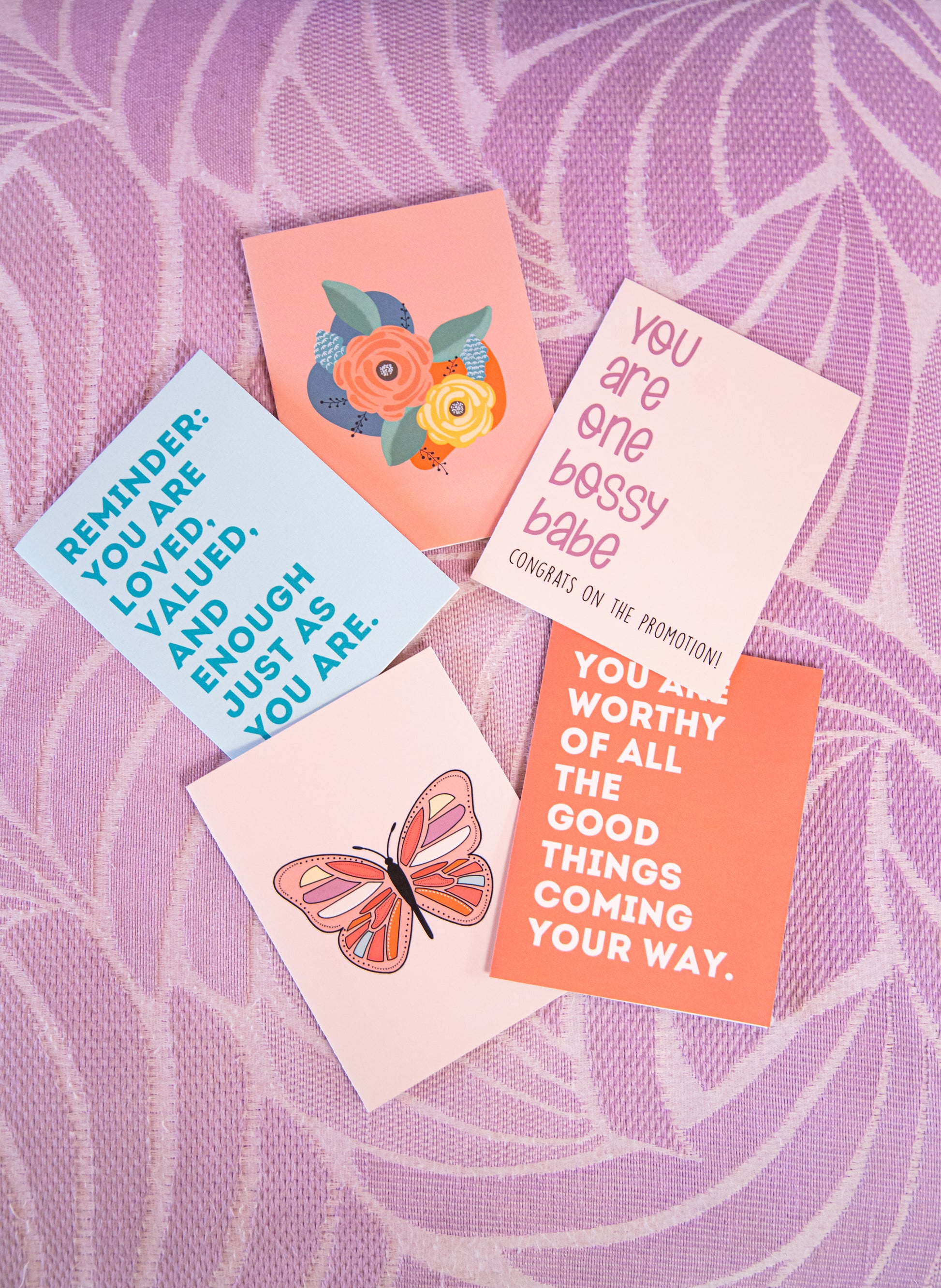 These handmade greeting cards are 100% made in the USA and with Forest Stewardship Council (FSC) certified matte cardstock. Each folding greeting card is A2 and comes with a coordinating envelope. Packaged individually in a clear protective sleeve.
